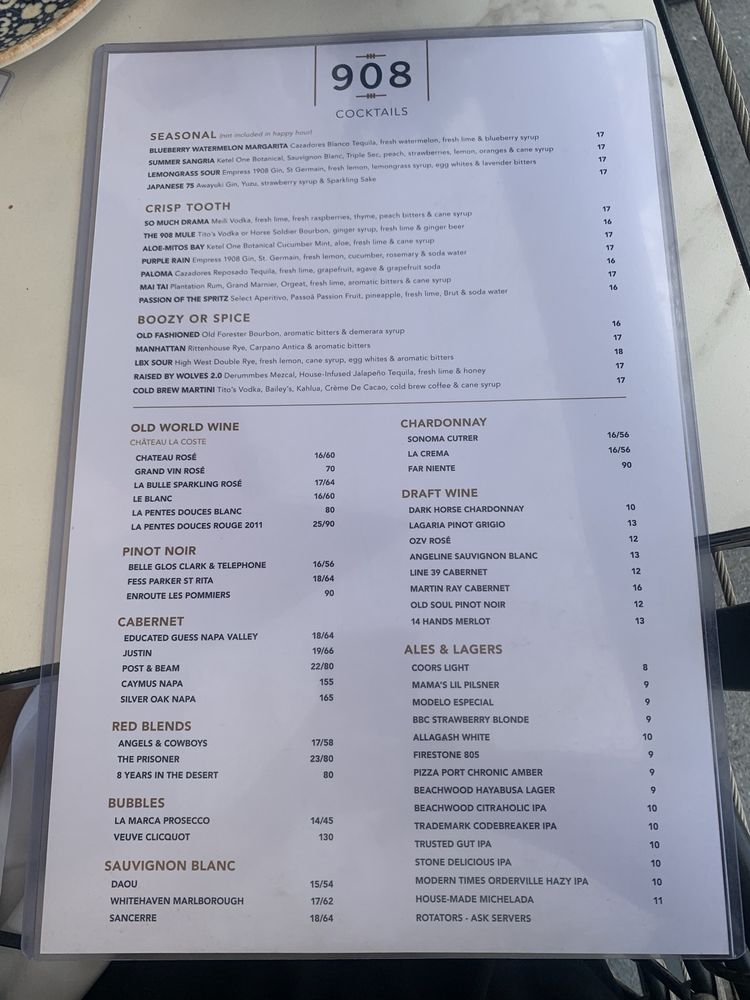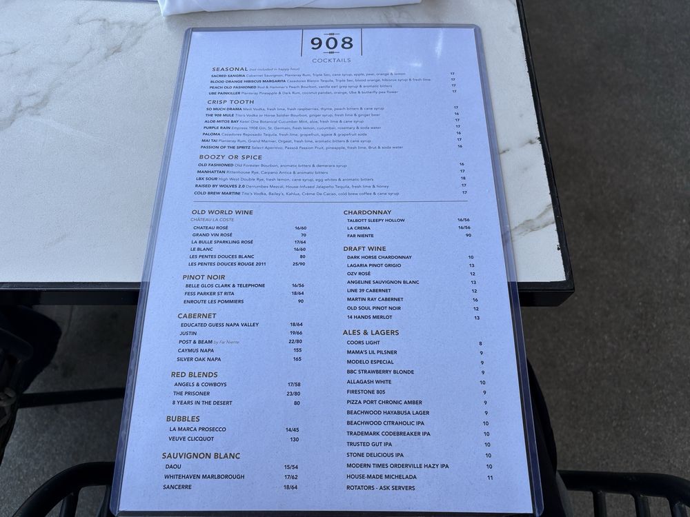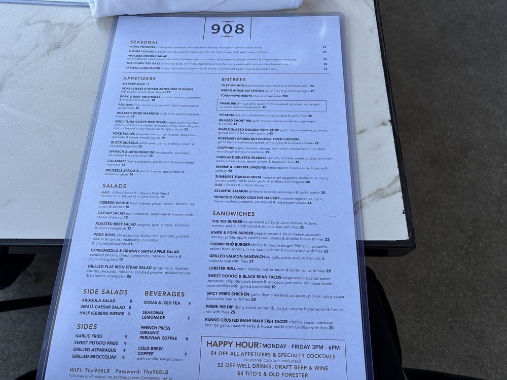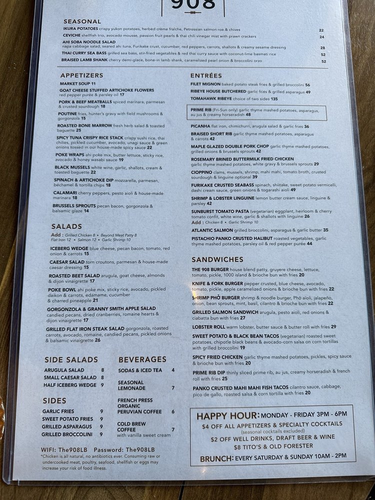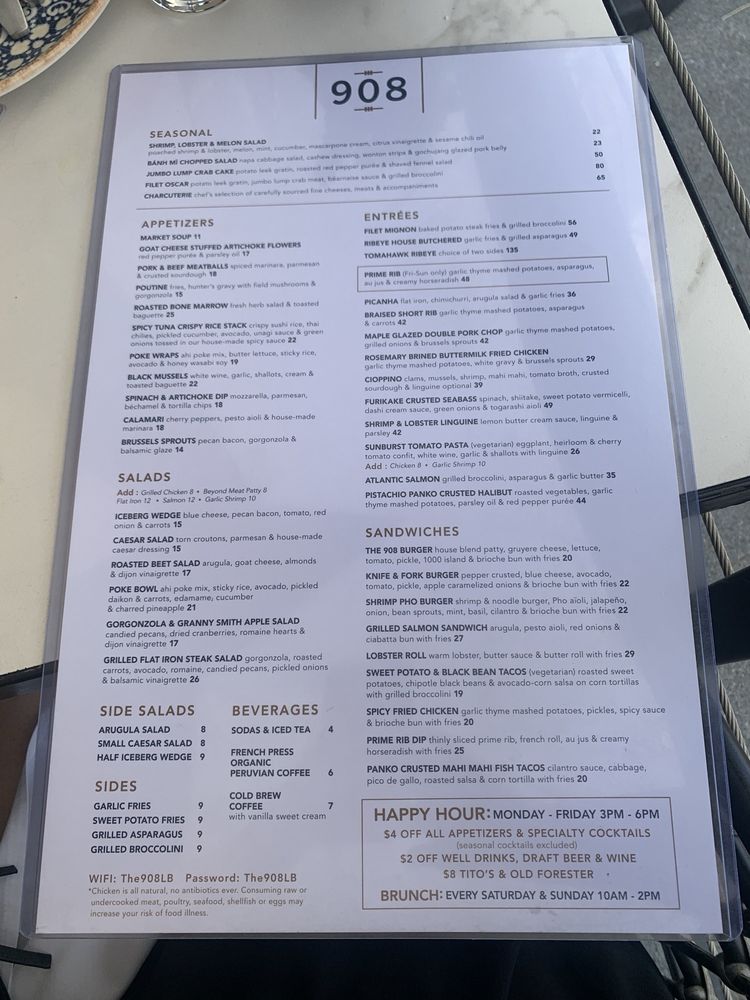 Introducing the menu of The 908, a New American Cocktail Bar in Long Beach, CA. With a diverse selection of appetizers such as Black Mussels White Wine, Brussels Sprouts App, and Roasted Bone Marrow, there is something for everyone. The salads offer unique options like Ahi Soba Salad and Grilled Flat Iron Steak Salad. Sandwich lovers can try the 908 Burger or the Panko Crusted White Fish Tacos. Customer reviews praise the friendly service and flavorful dishes, making it a go-to spot for brunch or dinner. Don't miss out on the sophisticated yet relaxed atmosphere, complete with indoor and outdoor seating options. The menu at The 908 caters to a variety of dietary preferences, including vegan and vegetarian options. Whether you're looking for a casual meal or a special night out, The 908 has something for every palate.