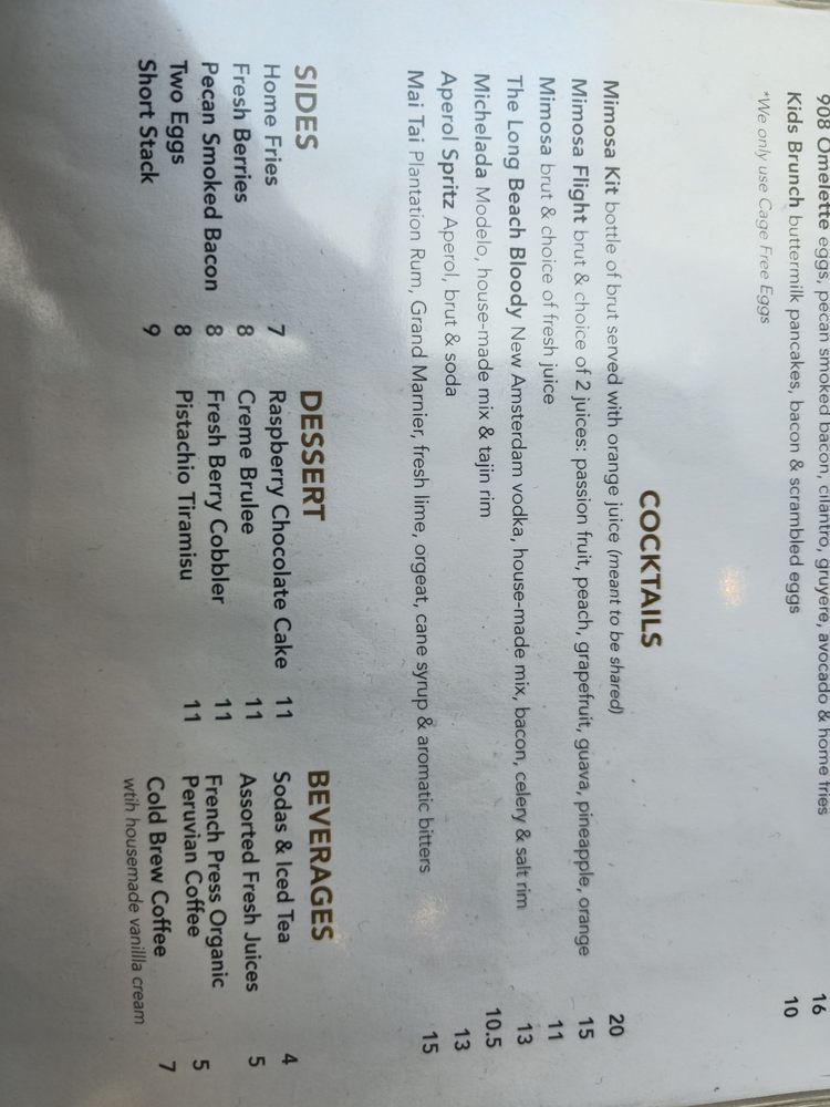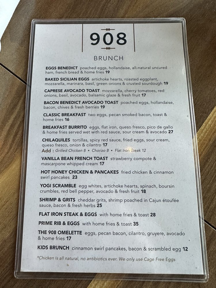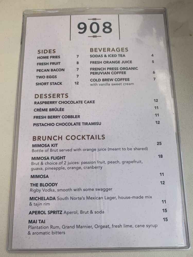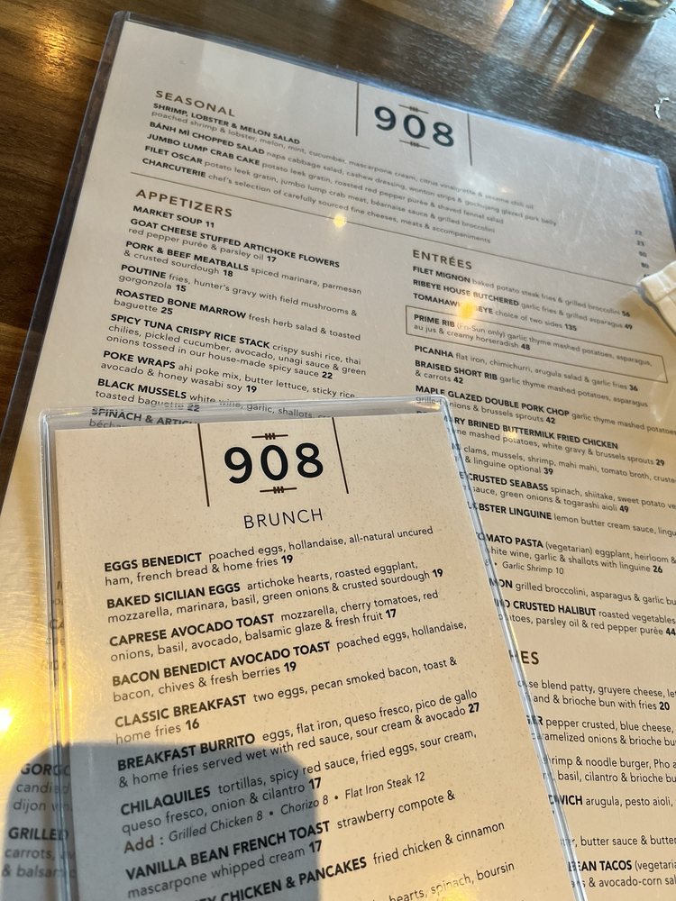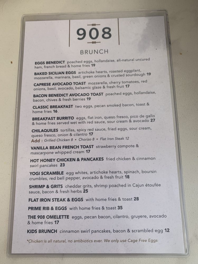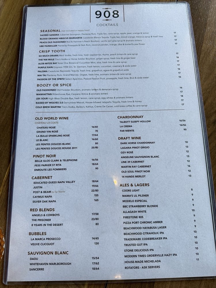 Introducing the menu of The 908, a New American Cocktail Bar in Long Beach, CA. With a diverse selection of appetizers such as Black Mussels White Wine, Brussels Sprouts App, and Roasted Bone Marrow, there is something for everyone. The salads offer unique options like Ahi Soba Salad and Grilled Flat Iron Steak Salad. Sandwich lovers can try the 908 Burger or the Panko Crusted White Fish Tacos. Customer reviews praise the friendly service and flavorful dishes, making it a go-to spot for brunch or dinner. Don't miss out on the sophisticated yet relaxed atmosphere, complete with indoor and outdoor seating options. The menu at The 908 caters to a variety of dietary preferences, including vegan and vegetarian options. Whether you're looking for a casual meal or a special night out, The 908 has something for every palate.